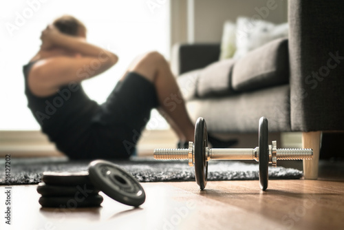 Home Workout Man Doing Ab Training And Crunches In Living Room