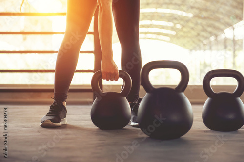 Fitness Training With Kettlebell In Sport Gym With Sunlight Effect
